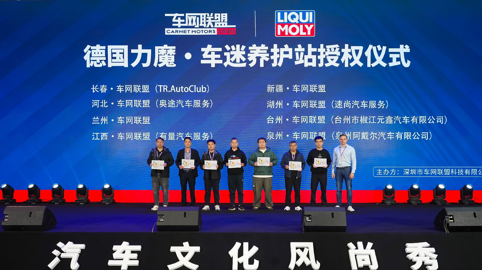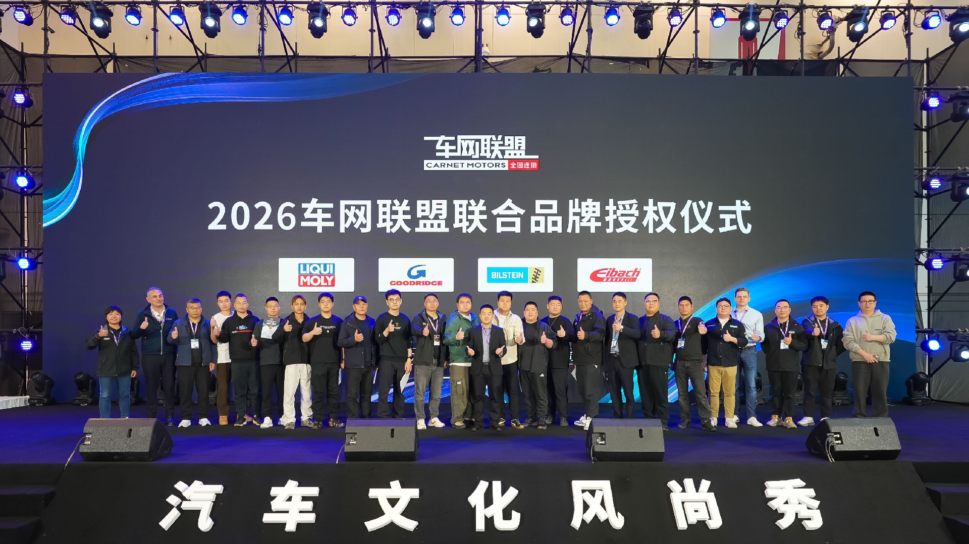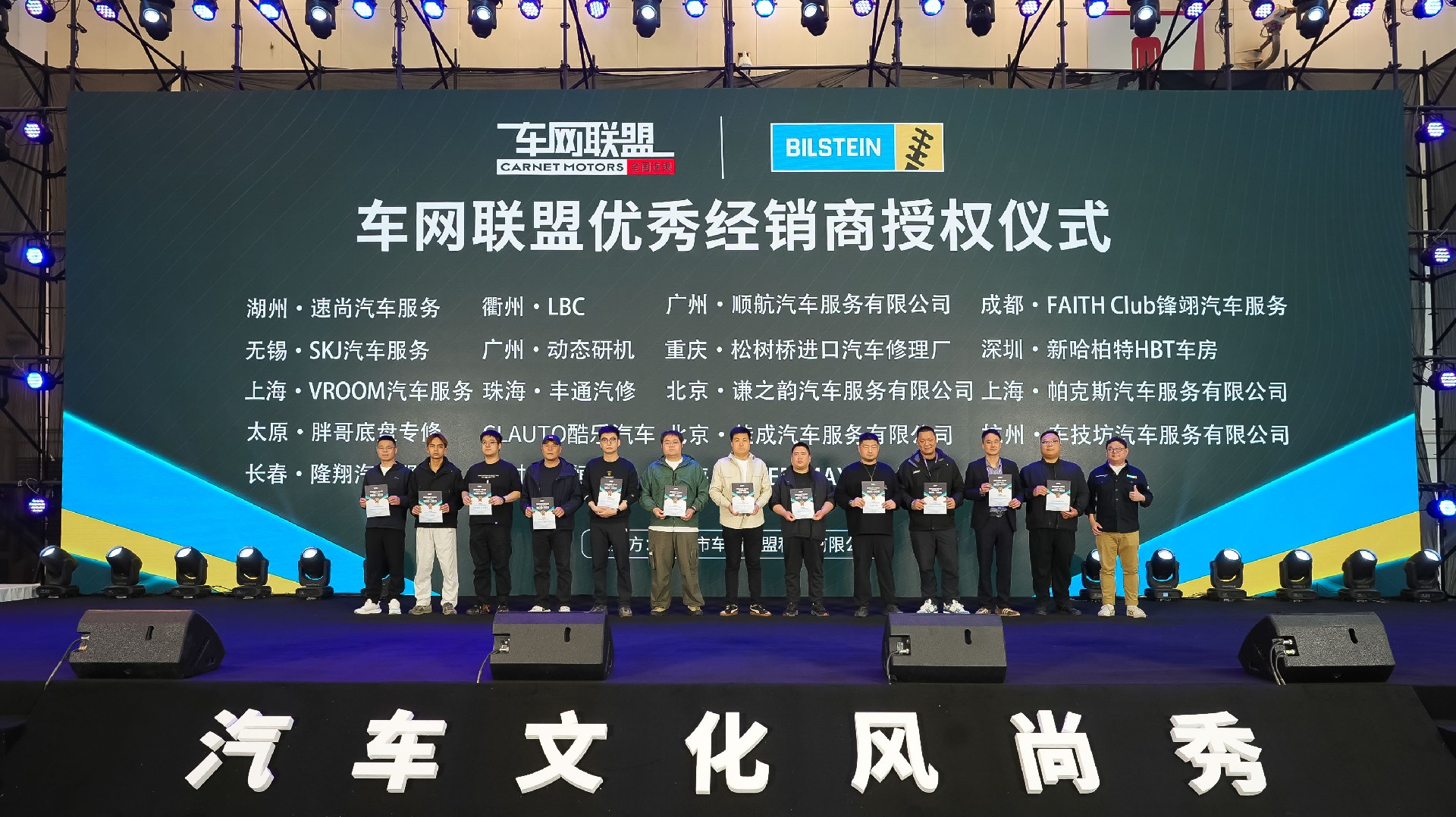 当天中午,我们延续往年“传统”,做了一件极具“排面”的大事:携手德国力魔、艾巴赫、倍适登、GD钢喉四大知名品牌,为车网联盟旗下的经销商代表们颁发了品牌授权证书。