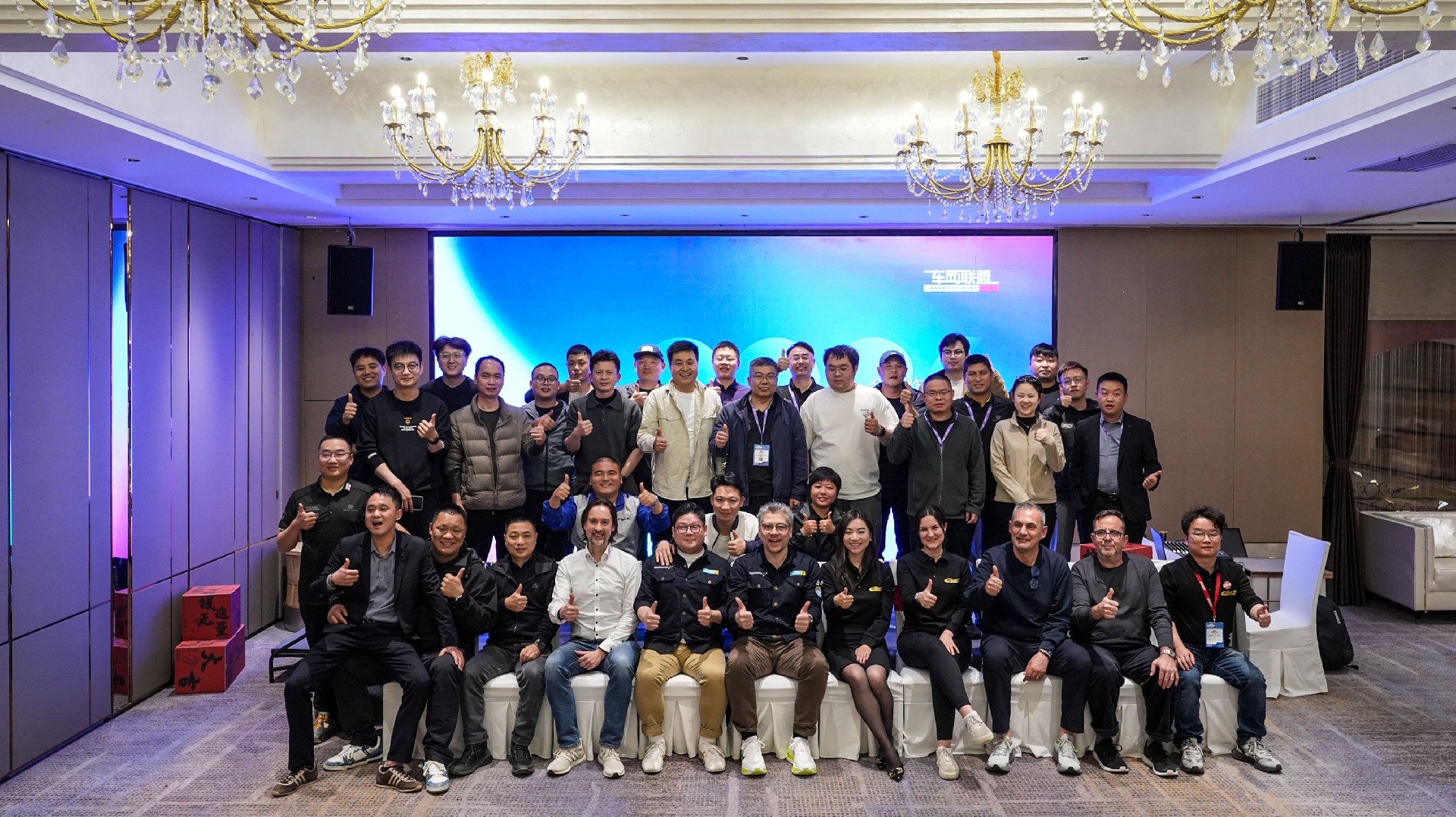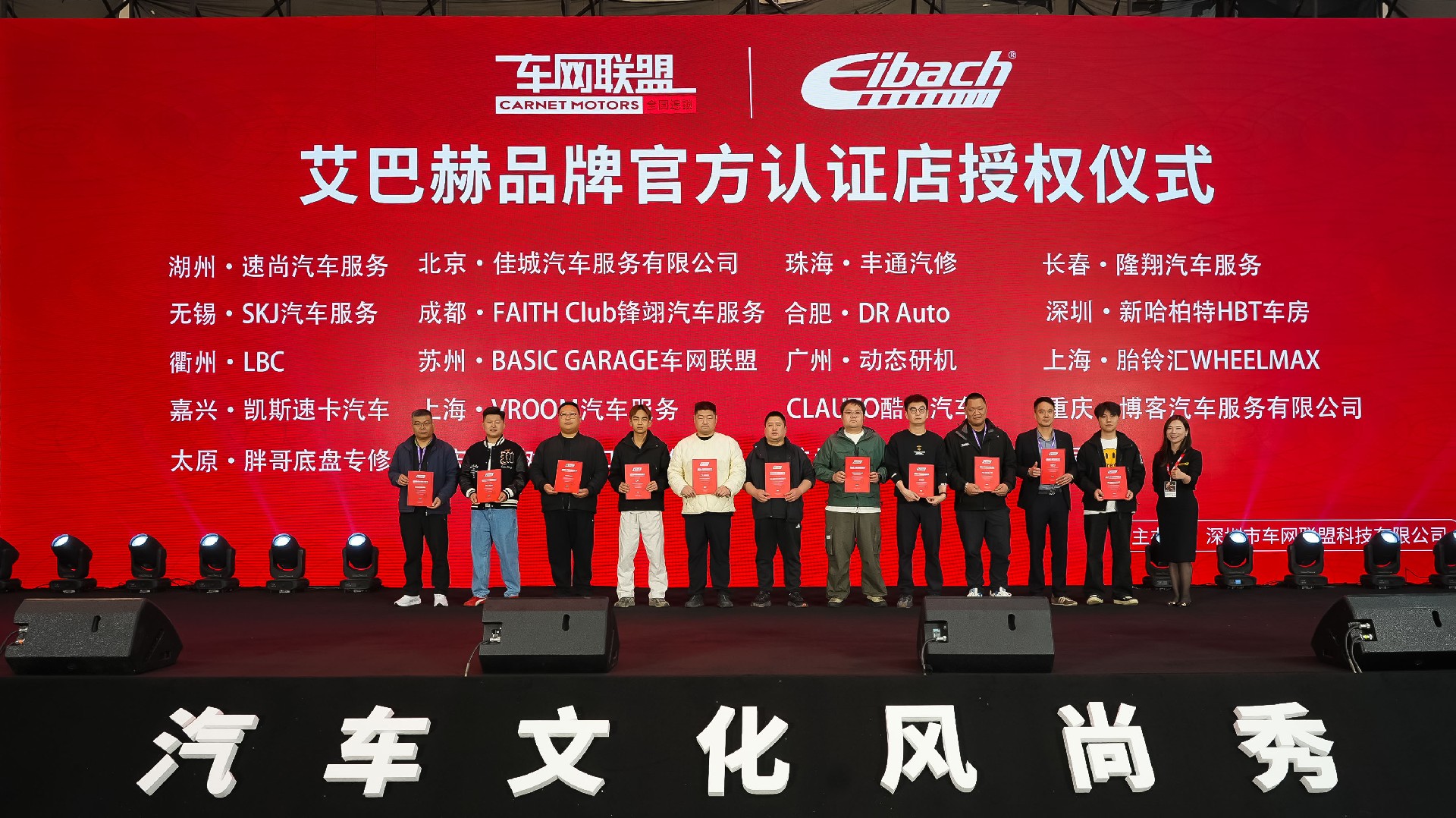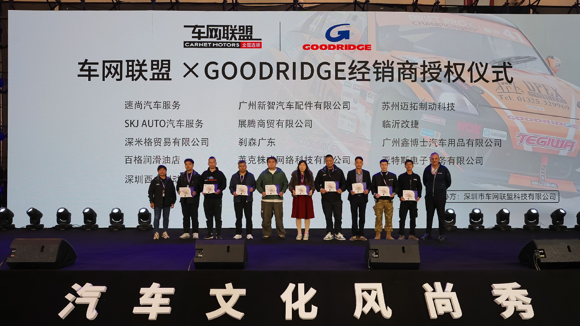当天中午,我们延续往年“传统”,做了一件极具“排面”的大事:携手德国力魔、艾巴赫、倍适登、GD钢喉四大知名品牌,为车网联盟旗下的经销商代表们颁发了品牌授权证书。